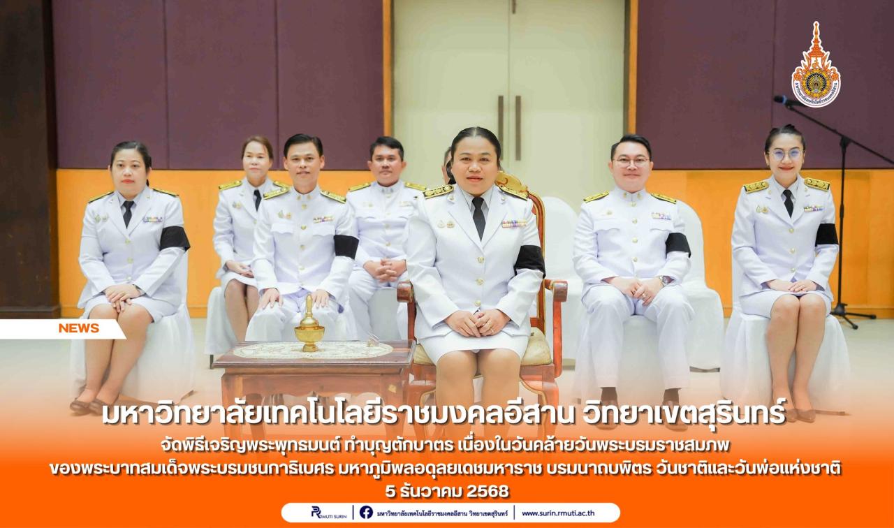 มหาวิทยาลัยเทคโนโลยีราชมงคลอีสาน วิทยาเขตสุรินทร์ จัดพิธีเจริญพระพุทธมนต์ ทำบุญตักบาตร เนื่องในวันคล้ายวันพระบรมราชสมภพ ของพระบาทสมเด็จพระบรมชนกาธิเบศร มหาภูมิพลอดุลยเดชมหาราช บรมนาถบพิตร วันชาติและวันพ่อแห่งชาติ 5 ธันวาคม 2568...