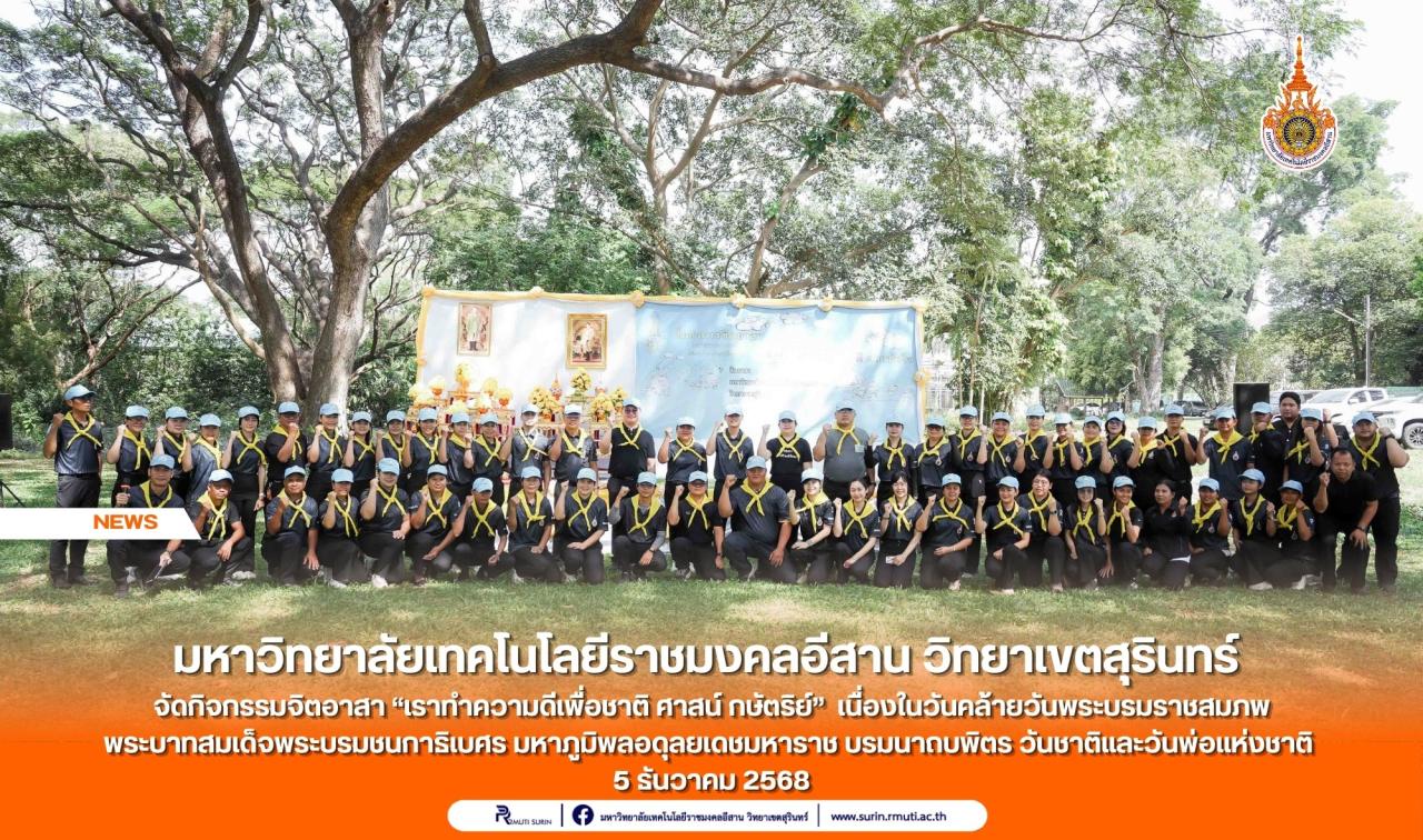 มหาวิทยาลัยเทคโนโลยีราชมงคลอีสาน วิทยาเขตสุรินทร์ จัดกิจกรรมจิตอาสา “เราทำความดีเพื่อชาติ ศาสน์ กษัตริย์” เนื่องในวันคล้ายวันพระบรมราชสมภพ พระบาทสมเด็จพระบรมชนกาธิเบศร มหาภูมิพลอดุลยเดชมหาราช บรมนาถบพิตร วันชาติและวันพ่อแห่งชาติ 5 ธันวาคม 2568 ...