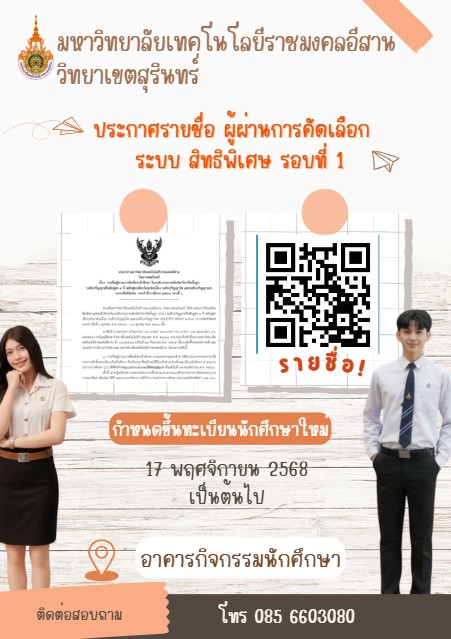 ประกาศรายชื่อผู้ผ่านการคัดเลือกบุคคลเข้าศึกษา ระบบสิทธิพิเศษ ประจำปีการศึกษา 2569 รอบที่ 1