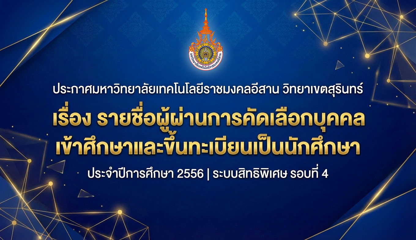 ประกาศมหาวิทยาลัยเทคโนโลยีราชมงคลอีสาน  วิทยาเขตสุรินทร์ เรื่อง  รายชื่อผู้ผ่านการคัดเลือกบุคคลเข้าศึกษาและขึ้นทะเบียนเป็นนักศึกษา   ประจำปีการศึกษา 2569 ระบบสิทธิพิเศษ   รอบที่ 4