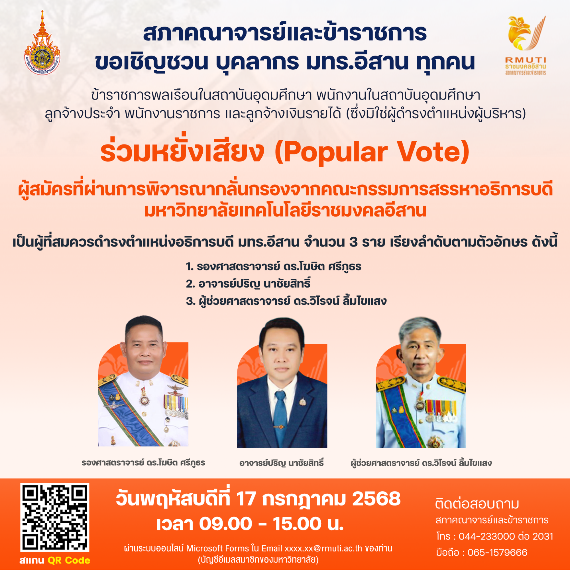 สภาคณาจารย์และข้าราชการ ขอเชิญชวน บุคลากร มทร.อีสาน ทุกท่าน ร่วมหยั่งเสียง (Popular Vote) ผู้สมัครเข้ารับการสรรหาอธิการบดี