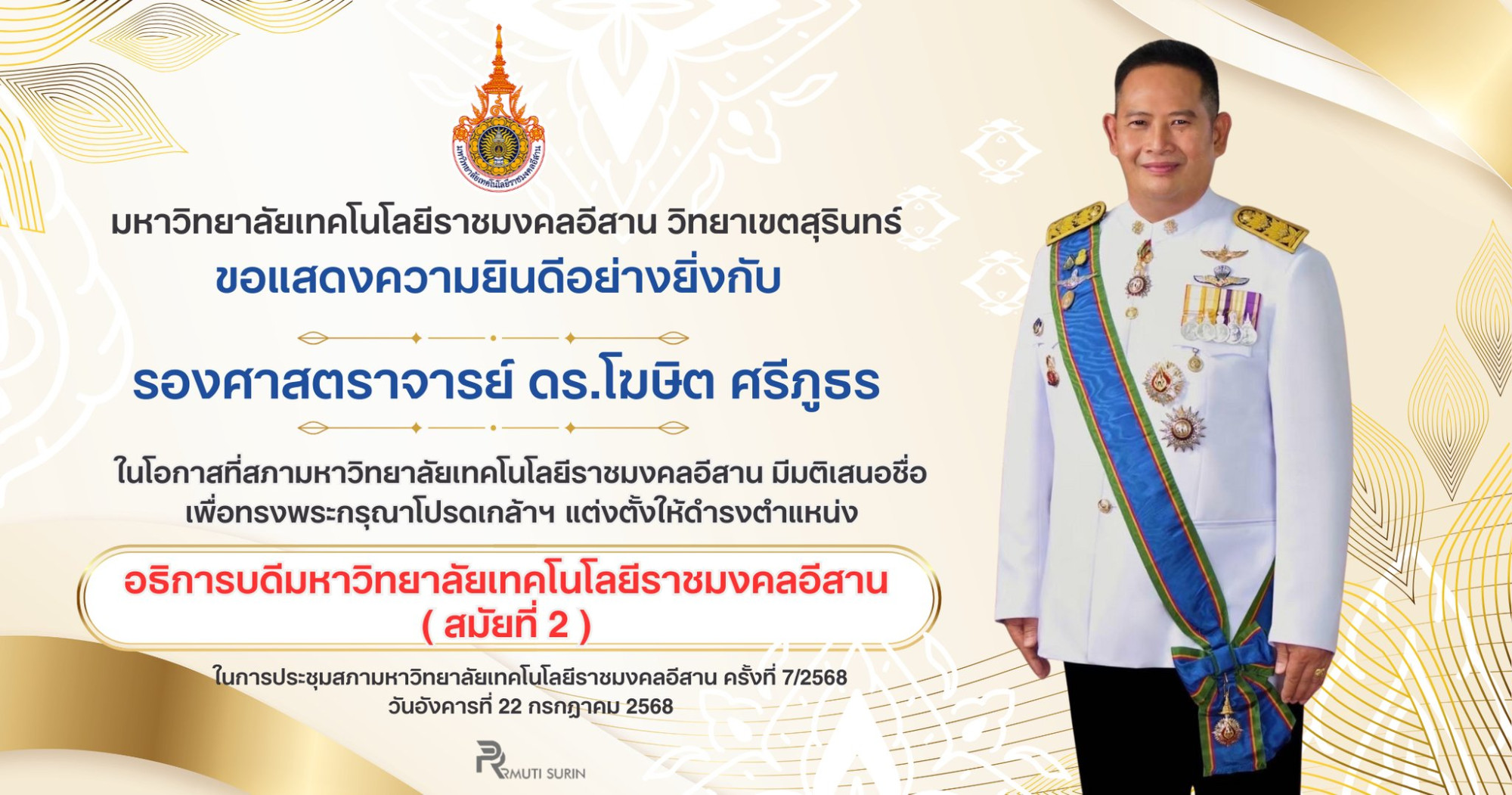 ขอแสดงความยินดีอย่างยิ่งกับ รองศาสตราจารย์ ดร.โฆษิต ศรีภูธร ในโอกาสที่สภามหาวิทยาลัยเทคโนโลยีราชมงคลอีสาน มีมติเสนอชื่อ เพื่อทรงพระกรุณาโปรดเกล้าฯ แต่งตั้งให้ดำรงตำแหน่ง อธิการบดีมหาวิทยาลัยเทคโนโลยีราชมงคลอีสาน (สมัยที่2)