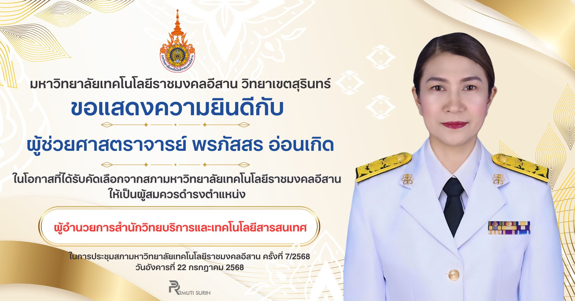 ขอแสดงความยินดีกับ ผู้ช่วยศาสตราจารย์ พรภัสสร อ่อนเกิด ในโอกาสที่ได้รับคัดเลือกจากสภามหาวิทยาลัยเทคโนโลยีราชมงคลอีสานให้เป็นผู้สมควรดำรงตำแหน่ง ผู้อำนวยการสำนักวิทยบริการและเทคโนโลยีสารสนเทศ