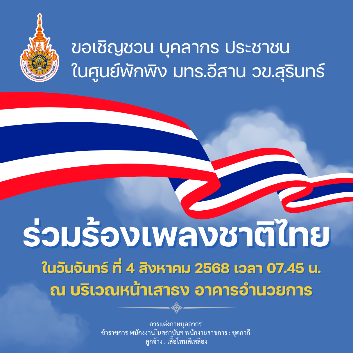 ชอเชิญชวนบุคลากร ประชาชน ในศูนย์พักพิง มทร.อีสาน วข.สร. ร่วมกิจกรรมร้องเพลงชาติไทย ณ บริเวณหน้าเสาธง อาคารอำนวยการ บุคลากร