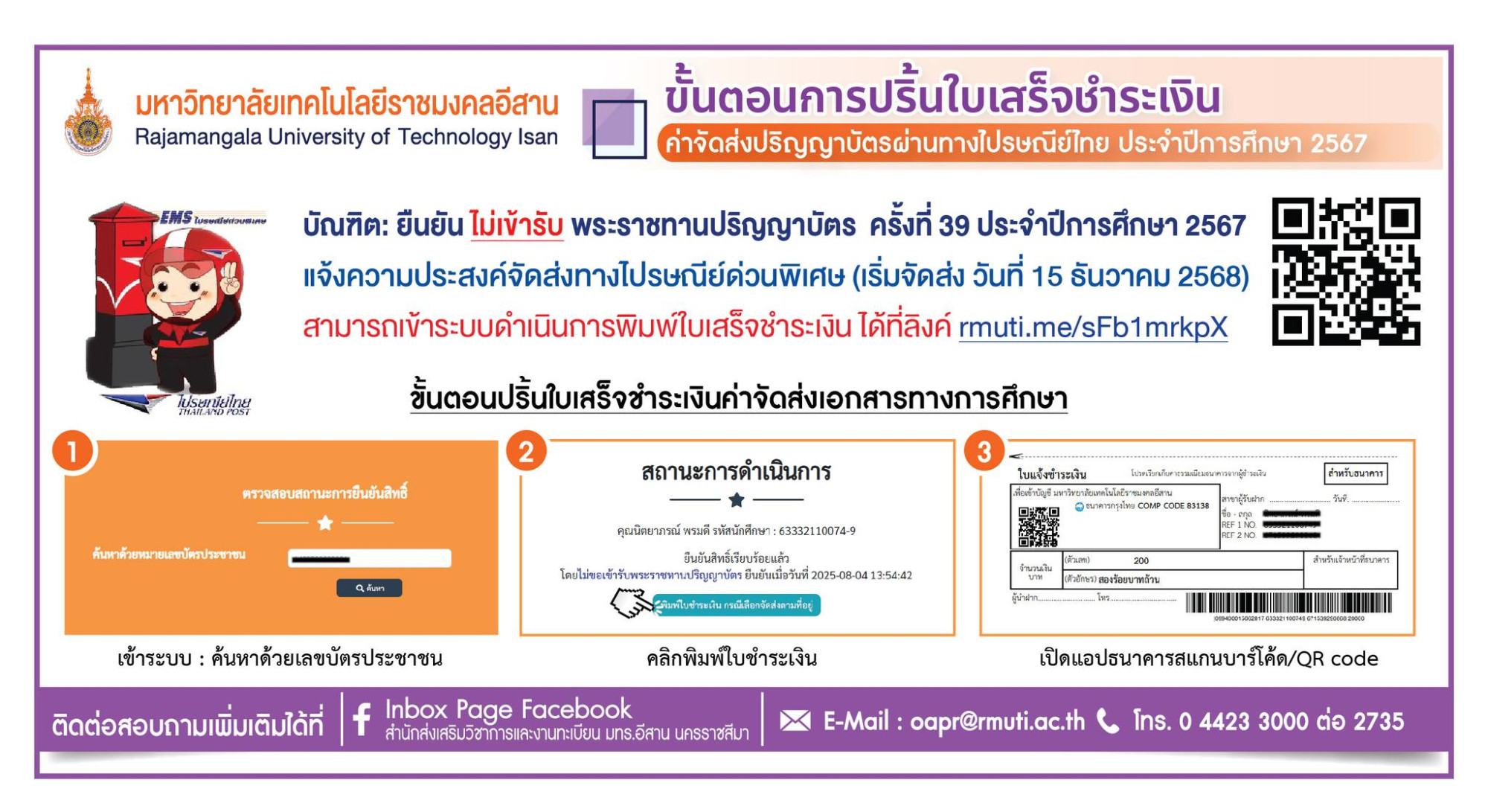 ขั้นตอนการปริ้นใบเสร็จชำระเงิน ค่าจัดส่งปริญญาบัตรผ่านทางไปรษณีย์ไทย ประจำปีการศึกษา 2567